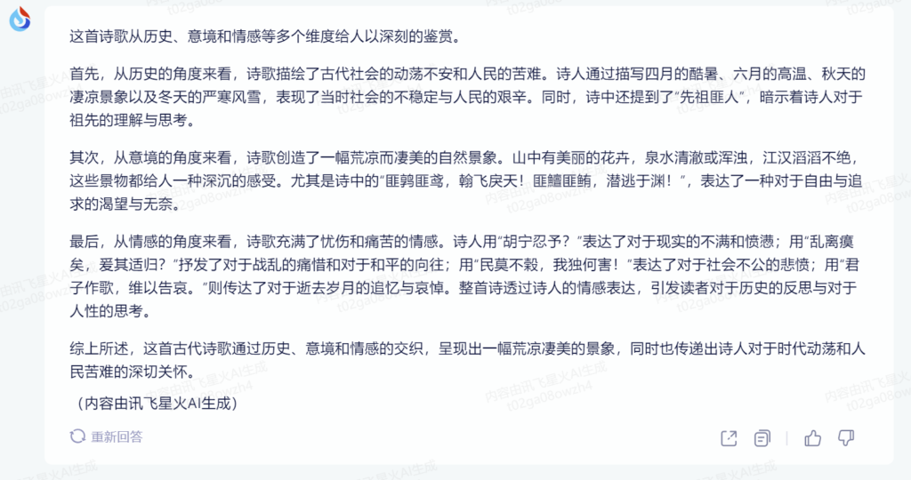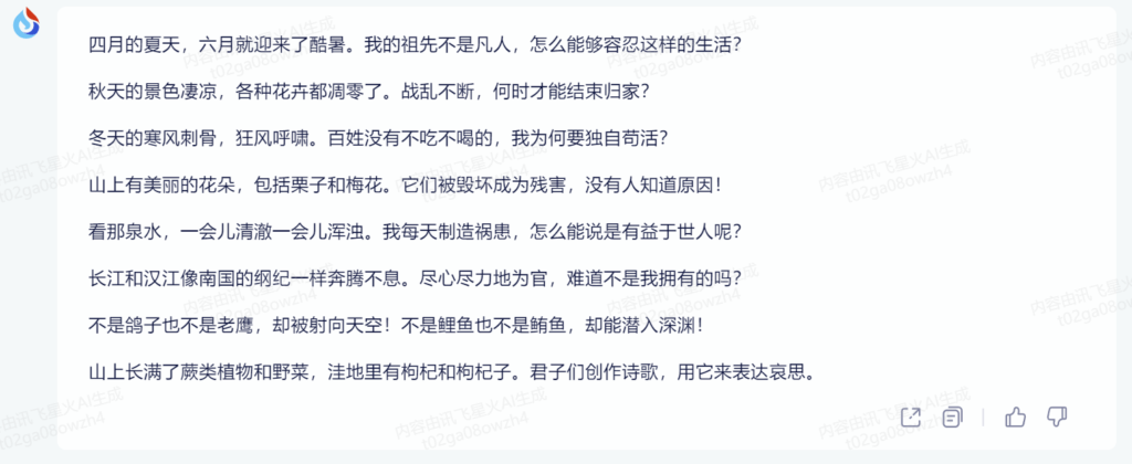- 抛开词不达意,讯飞星火的文字更优美一些,只可惜对诗经《四月》的理解不够。