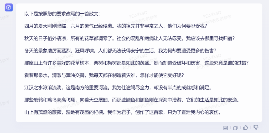 这一环节,同时要求文心一言和讯飞星火分别对诗经的《四月》进行仿写,翻译,改写和鉴赏,最终得出的结论如下:
