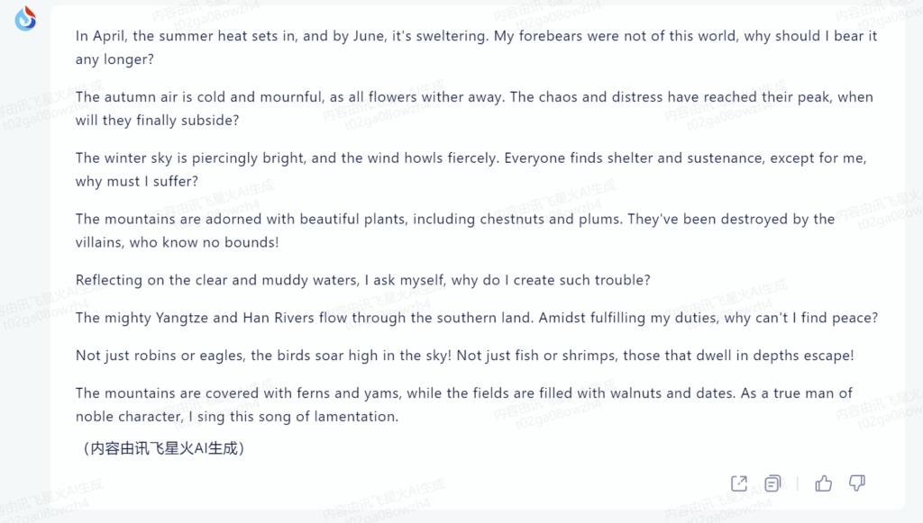 为什么?讯飞星火的翻译直接将诗歌改成了散文。文心一言至少没有改变文体。