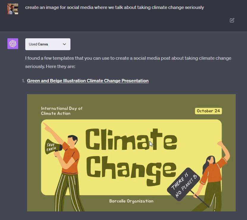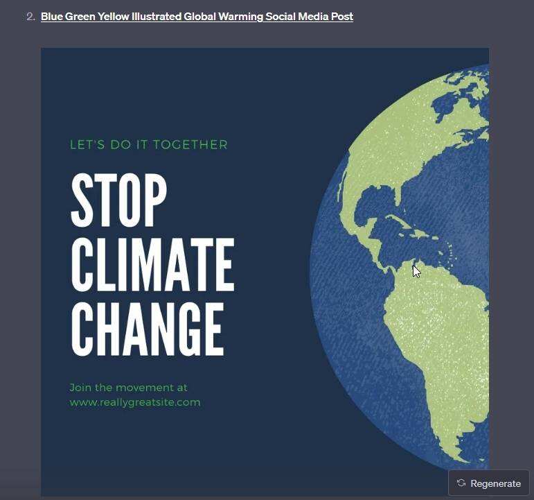 6. 现在,请输入您要创建的图片或视频的提示。首先,我们要求 ChatGPT 为有关气候变化的社交媒体文章生成图片,它在一分钟内就生成了一些令人印象深刻的结果。
