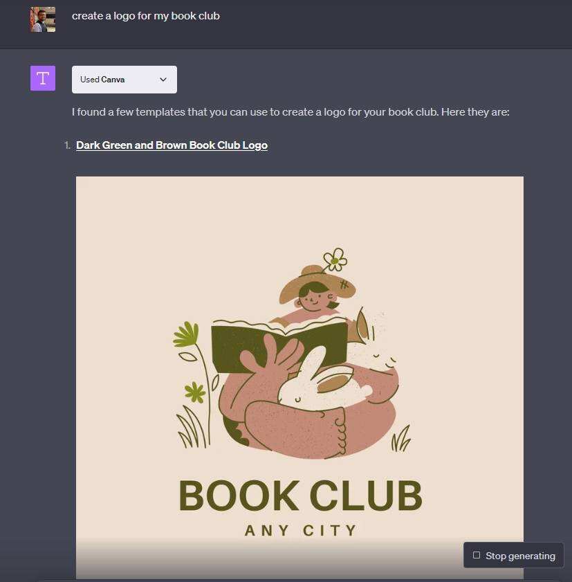 8. 接下来,您可以让 ChatGPT 上的 Canva 插件为您的公司或品牌创建一个徽标。