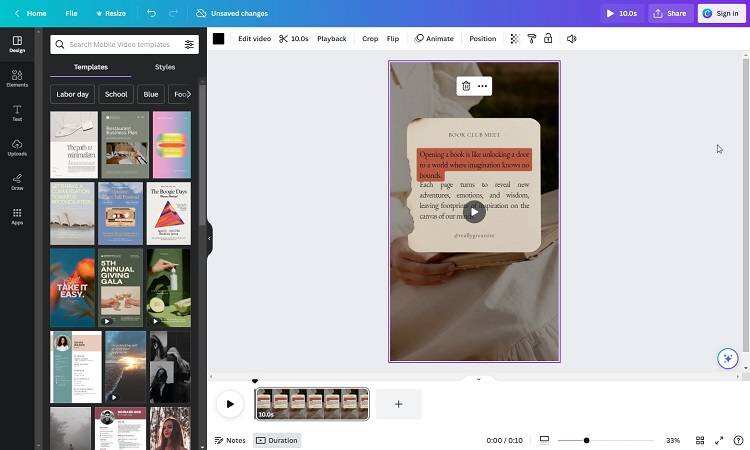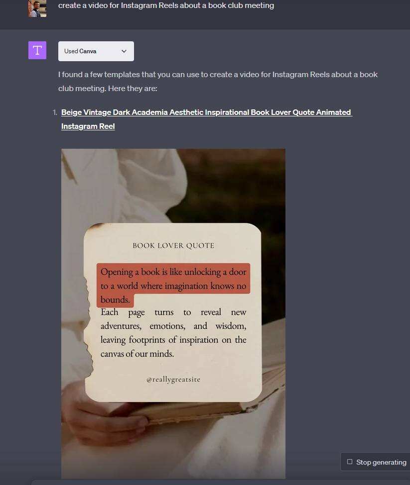 9. 最后,我们尝试使用 ChatGPT Canva 插件为 Instagram 制作 Reels 视频,邀请用户参加读书俱乐部会议。您可以直接从 ChatGPT 下载并使用该视频。