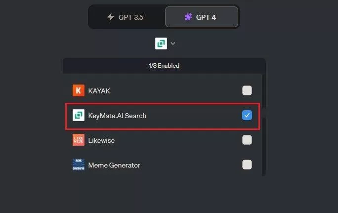 然后,从 GPT-4 下拉菜单中启用该插件。您会看到旁边有一个蓝色的”√”。