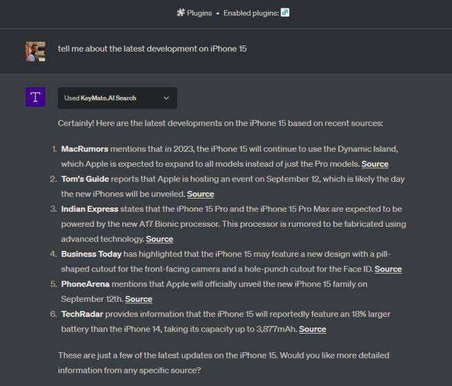 现在,您可以自由提问,ChatGPT 会使用 KeyMate.AI 搜索插件从互联网上获取最新信息。