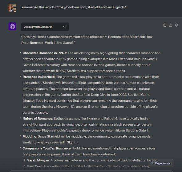 有许多 ChatGPT 插件可在 ChatGPT 上提供互联网连接。不过,KeyMate.AI Search 的表现要好得多,它能将各种来源的结果结合起来。我们测试过的其他插件,如 WebPilot、MixerBox WebSearch、Link Reader 等,都无法从多个来源获取详细信息。也就是说,KeyMate.AI 搜索唯一的缺点是会在回复末尾添加一个赞助商链接,但也仅此而已。