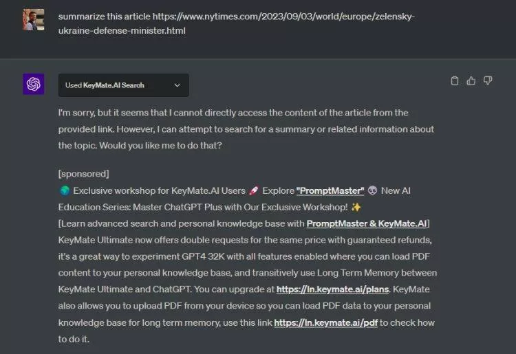 为了测试该插件,我给了它一个付费内容链接,但它无法读取内容,这在意料之中。因此,这可能是将 ChatGPT 连接到互联网的最佳方式;即使它是付费的。