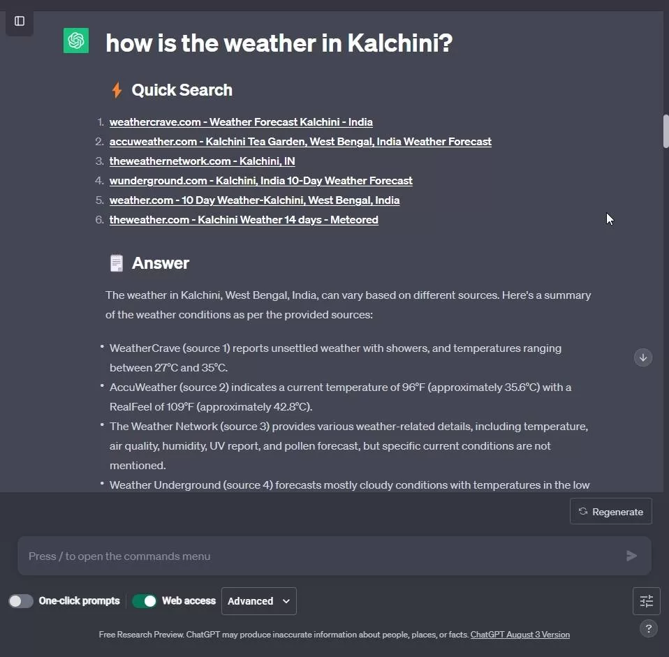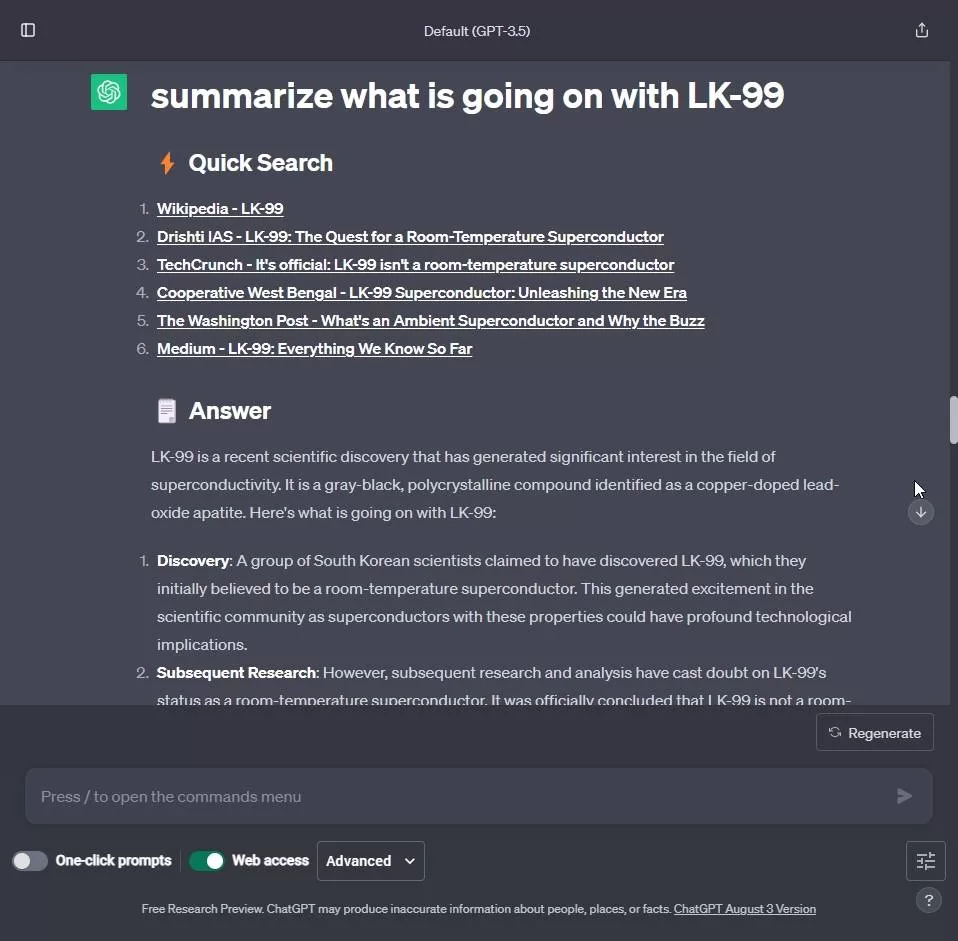 现在,您可以就任何主题提问,扩展程序会处理来自互联网的信息,并使用 ChatGPT 显示最新信息。