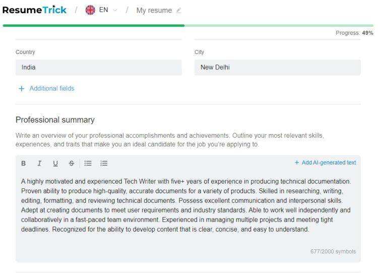您只需添加工作职位、姓名、电子邮件地址、电话号码、城市等基本信息,就可以开始使用人工智能生成描述。您可以使用人工智能生成定制的专业摘要和经验。这样,制作简历和求职信就成了一项几分钟内就能完成的任务。
