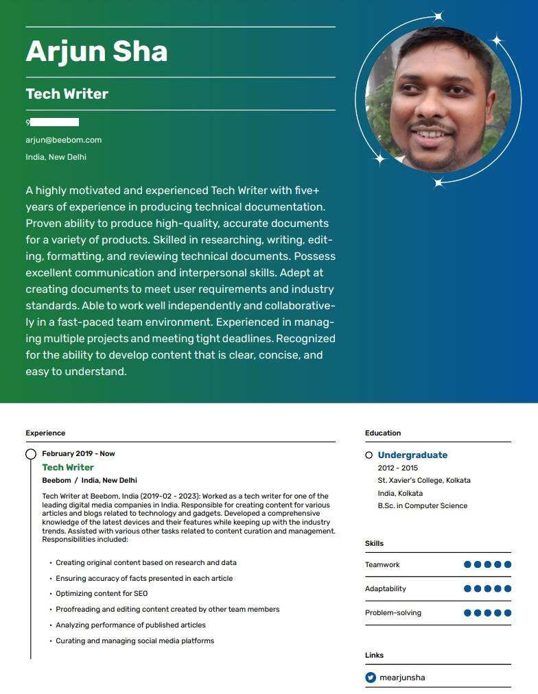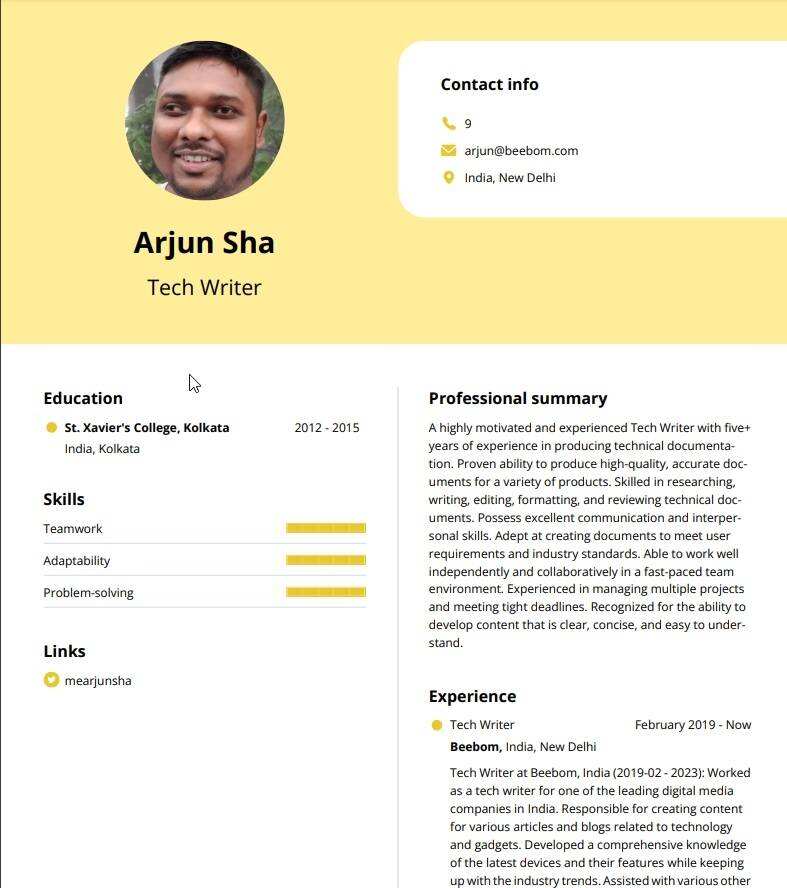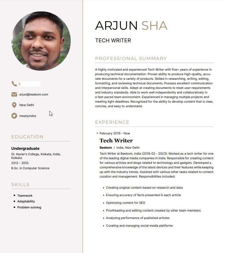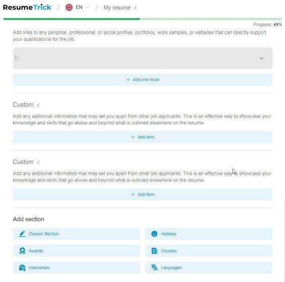 Resume Trick 最棒的地方在于它的简历制作界面。你可以使用左侧的预定义字段添加个人信息,还可以插入专业摘要。除此之外,你还可以提及自己的经历、教育详情、技能和专业知识、作品集链接等。如果您想添加自定义部分,使简历更加个性化,也可以轻松实现。最后,你还可以更改背景,添加照片、爱好、奖项、实习经历等。