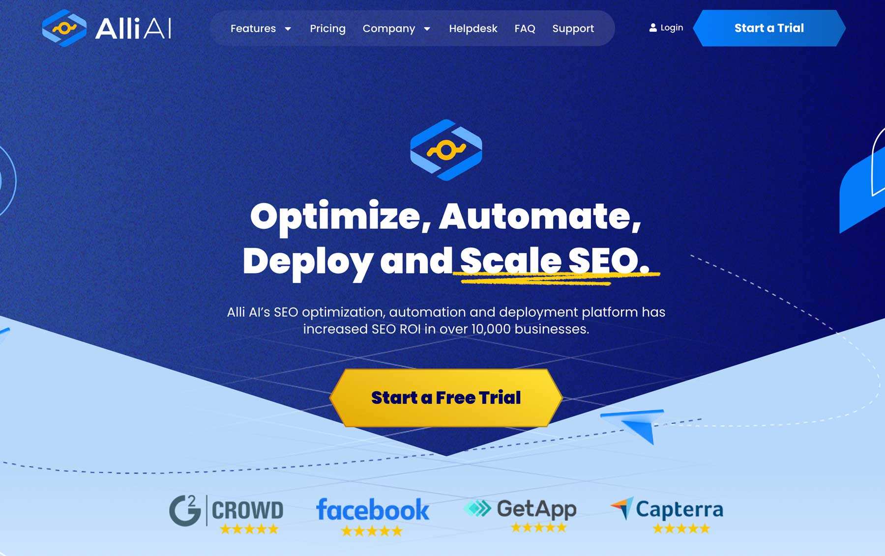 在我们的榜单中,排名第一的人工智能搜索引擎优化工具是 Alli AI,它提供了丰富的功能来简化网站的搜索引擎优化管理。有了 Alli AI,只需单击一下,就可以通过创建全站优化规则,小到单页级别,大规模优化页面搜索引擎优化。Alli 可以为全站的页面和文章生成页面标题、元描述和内容更改,让您在更短的时间内完成更多工作。