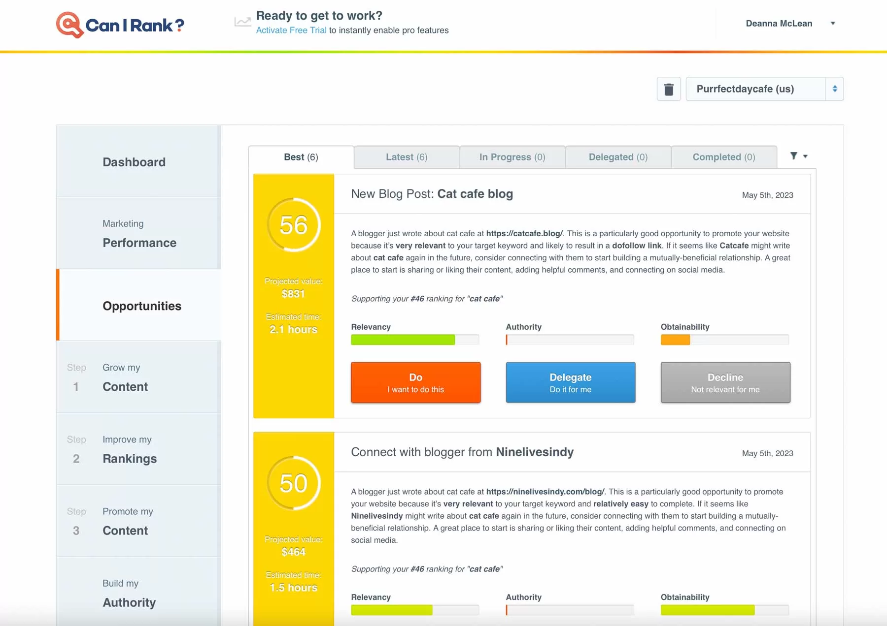 Can I Rank 为网站所有者提供了最有价值的功能之一,即在对网站进行初步扫描后提供可操作的解决方案。它利用人工智能搜索互联网,就采取哪些措施来提高网站排名提出建议,如果您需要外包工作,还可提供预计成本和完成时间。当我们测试该平台时,它为我们提供了与我们的关键词相关的特定帖子,以及联系帖子作者要求推广我们的猫咖网站的步骤。这对于希望提高搜索引擎优化排名并与经常发布类似业务信息的热门博客建立联系的小企业主来说尤其有用。通过一系列实用、简明的步骤,他们可以选择自己实施,也可以将工作外包给自由职业者或代理机构。