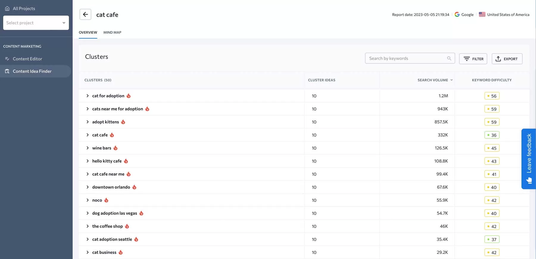 SE Ranking 具有令人印象深刻的功能,包括内容创意搜索器。该工具可分析与行业相关的关键词,并生成一份包含内容集群、搜索量和关键词难度的综合报告。这对创建内容战略、开设博客或制定内容日历非常有用。您可以点击其中一个主题,启动人工智能内容创建器,帮助您创建与该关键词相关的帖子。整个过程无缝、直观,是为企业创造新内容创意的绝佳方式。