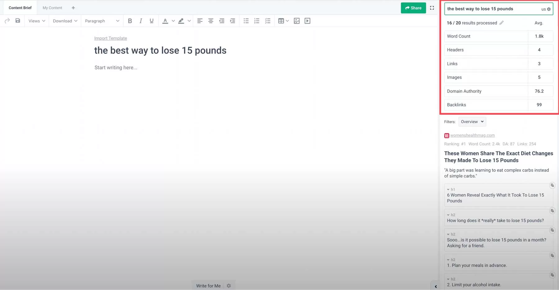 除了卓越的人工智能内容生成功能外,谷歌搜索控制台(GSC)内容分析工具无疑是最引人注目的功能。一旦您连接了 GSC 账户,该工具就会为您提供宝贵的见解,指导您的搜索引擎优化策略。在 Frase 应用程序的内容编辑器中,KPI 报告和其他重要指标(如排名页面、印象和每次点击成本)一目了然。此外,您还可以毫不费力地发现排名靠前的关键字及其平均排名位置,这有助于确定您的机遇。