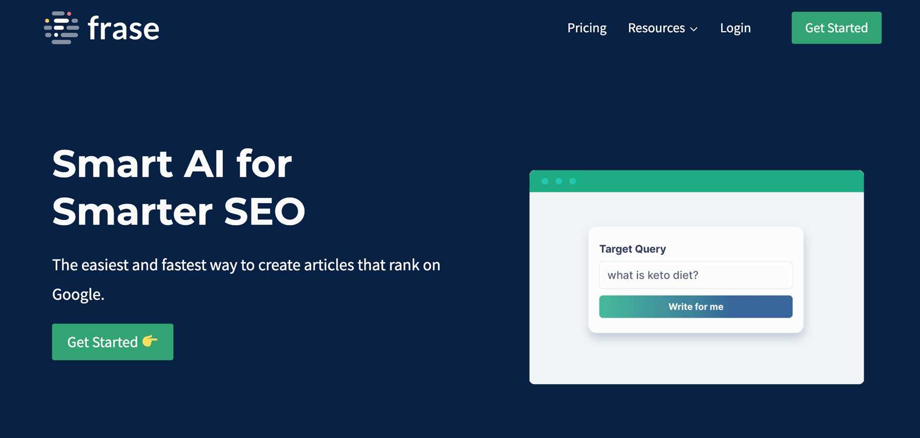 Frase 是最好的人工智能搜索引擎优化工具之一,它能提供有价值的见解来改进内容,同时帮助创建新内容并衡量网站性能。Frase 的价格适中,任何希望加强整体搜索引擎优化战略的人都可以使用。