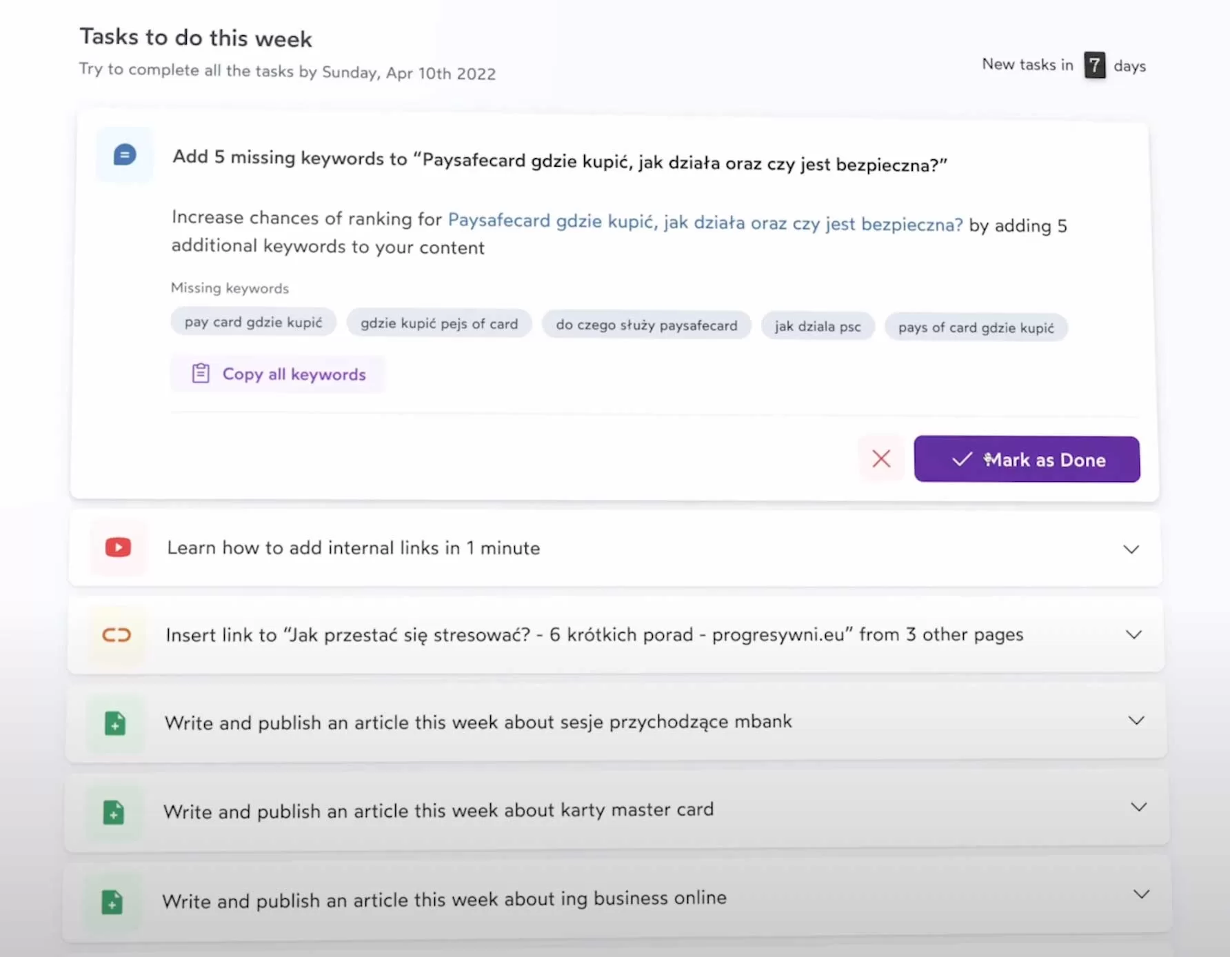 Surfer SEO 不仅是一款优秀的人工智能内容生成器,它还提供更多人工智能技术。他们的 Grow Flow 产品每周都会为您提供如何提高网站搜索引擎优化的建议。使用该工具,您将收到关键字缺失提醒,发现相关关键字以提高排名,发现内部链接机会,并根据行业生成文章创意以提高搜索引擎优化。