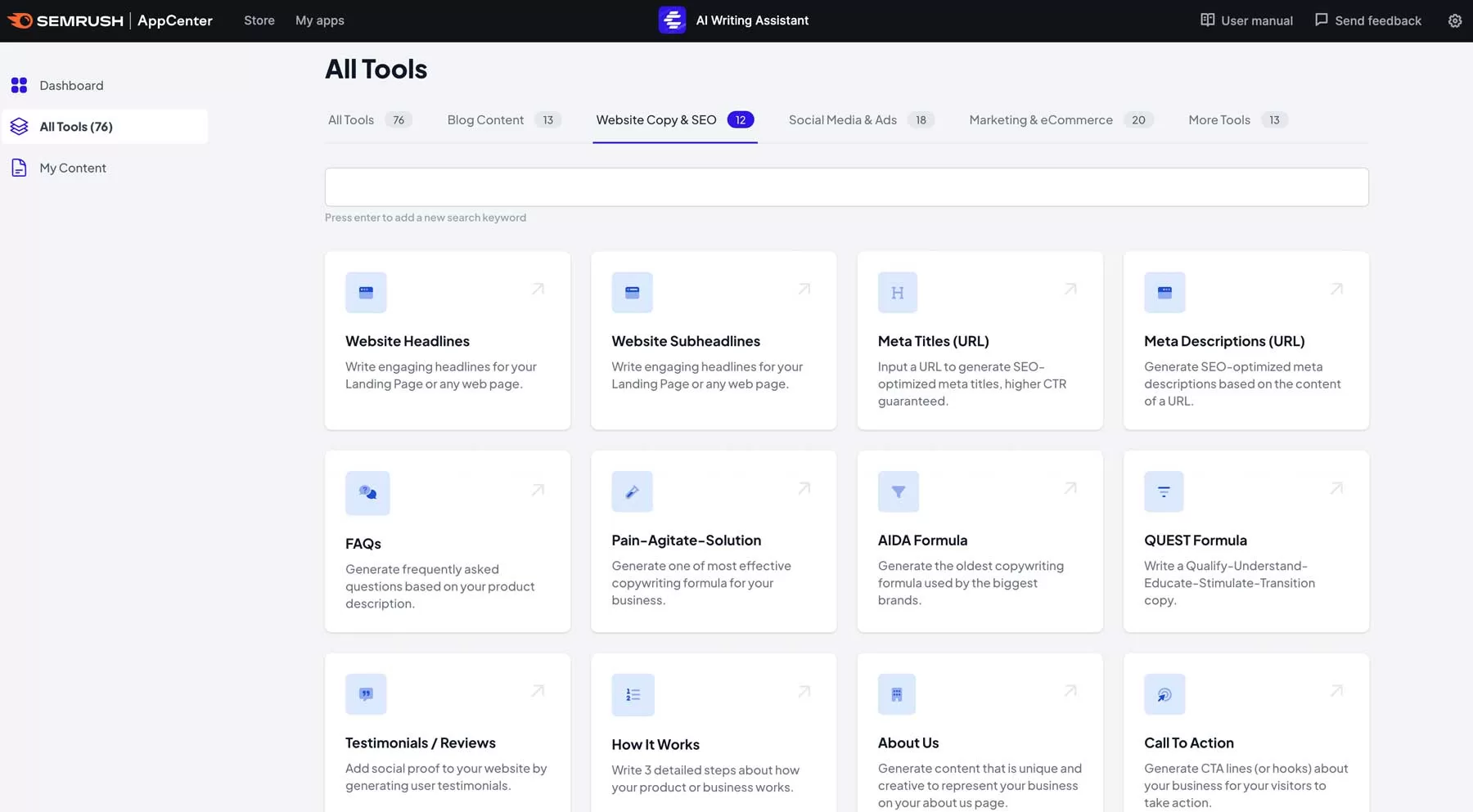 Semrush 提供 76 种强大的人工智能搜索引擎优化工具,包括写作助手和重新措辞工具,用于优化博客、亚马逊产品和社交媒体帖子等各种平台的内容。它可以生成博客创意,并改写现有内容以优化搜索引擎。不过,我们认为有必要指出,在测试过程中,我们需要多次尝试才能创造出有用的内容创意。不过,根据我们的提示,他们的其他人工智能工具,如文本到图片生成器、元描述创建器和常见问题答案生成器,都表现出色。