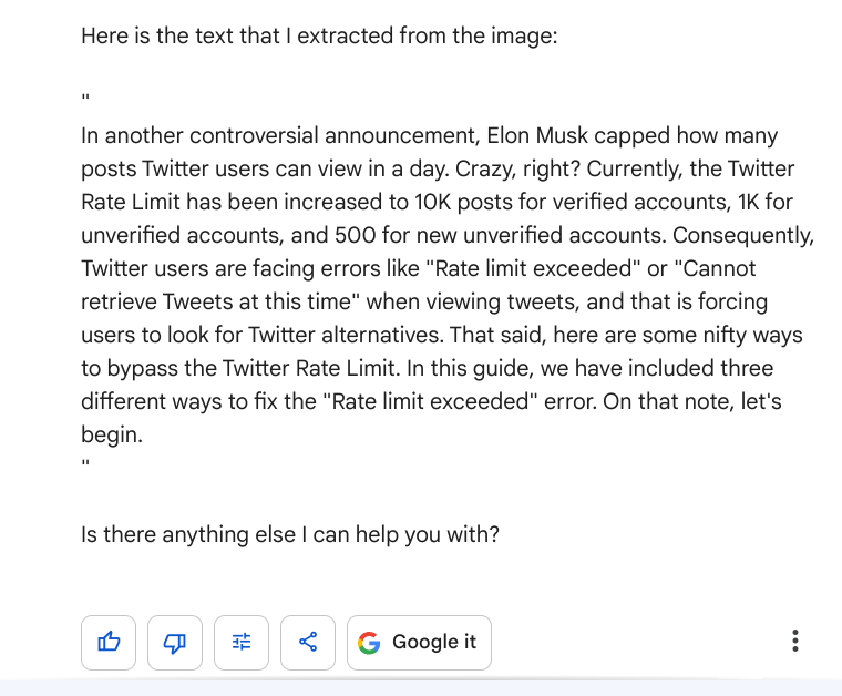 Bard 图像处理功能的最大优点是,现在只需点击 (+) 按钮就能上传图像。然后,它可以快速抓取上传内容中的文本。然后,Google Bard 就会自动执行 OCR 识别,并且准确无误。尽管如此,尽管 Bard 支持一长串语言,但目前 OCR 功能仅适用于英语。我尝试了多种国际和地区语言,但都无法从扫描图像中提取文本。不过,对于从图像中快速提取文本,Bard 还是很有帮助的。