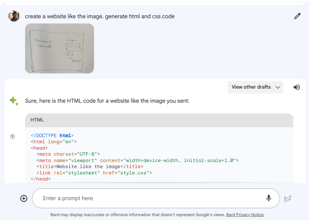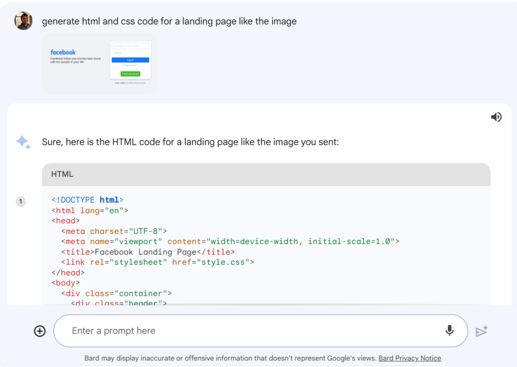我上传了 Facebook 登陆页面的截图,它很快就用 HTML 和 CSS 生成了看起来有些相似的代码。我还上传了一张我在纸上画的简单网站的图片,Google Bard 也能很好地还原它。此外,你还可以使用类似的方法来重现智能手机应用程序和其他网站的用户界面。