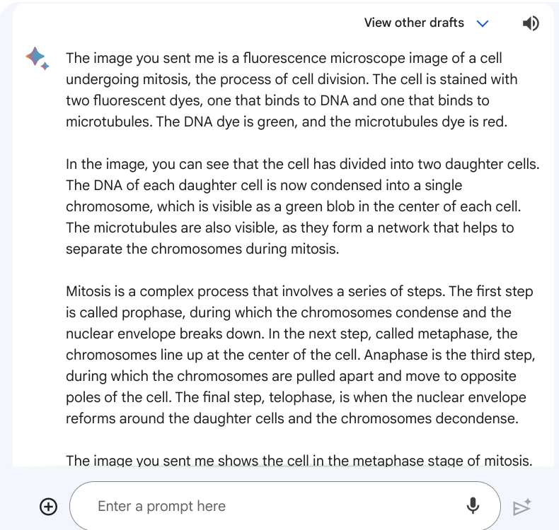 Google Bard 擅长解释图像并总结其中的内容。你可以上传晦涩难懂的图片,它也能快速生成可靠的信息。我上传了一张低质量的生物机制图片,它就正确地将其识别为细胞有丝分裂。它还一步一步地解释了这一过程。