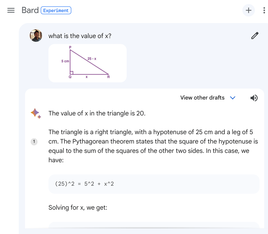 您还可以使用 Google Bard 解决数学问题。你可以将数学问题的图片上传到 Bard,它就会尝试为你解题。在我的测试中,Bard 的方法是正确的,但由于符号问题,它只能得出错误的答案。我认为需要对其视觉系统进行更新,使 Bard 更适合处理数学符号和问题。