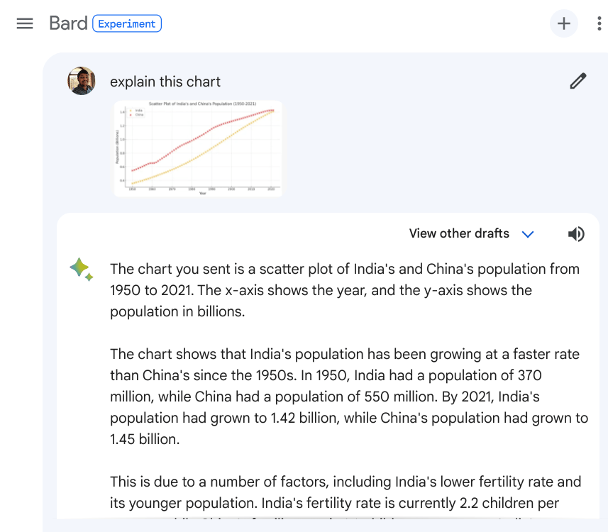 在另一个例子中,我上传了一张图表,它能正确理解图像并解释数据。它甚至还创建了一个数据点表格,这样我就可以在 Google Sheets 中进行处理。特别是对于学生来说,Bard 可以帮助他们理解科学概念和其他主题。您只需上传一张图片,然后向 Bard 询问即可。