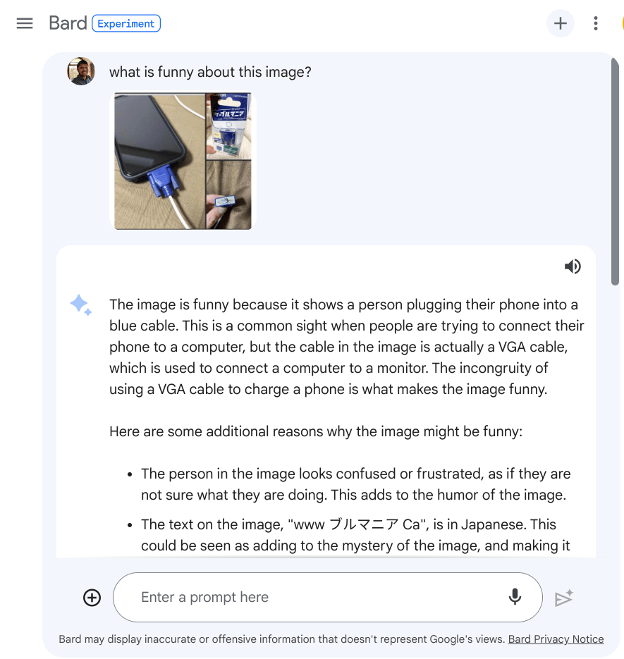 谷歌 Bard 还能解释流行语和笑话。你可以上传有趣的流行语和漫画图片,并询问 Bard 这些图片有趣在哪里, Bard 会给出自己的解释。我上传了 OpenAI 在 GPT-4 发布会上展示的同一张图片, Bard 正确地理解了图片背后的搞笑荒诞。