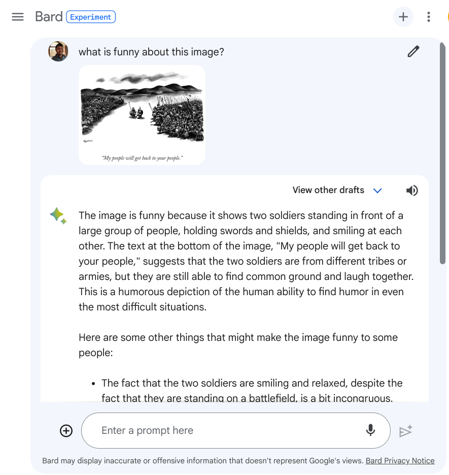 还有一次,我把《纽约客漫画》中的一张图片上传到 Google Bard,要求它解释这个笑话。然而,这次它只是简单地解释了场景,却说不出这张图片为什么好笑。它完全忽略了工作场所常用的电子邮件短语。我建议你自己试试 Google Bard,看看它是否足够聪明,能够理解机智和幽默。