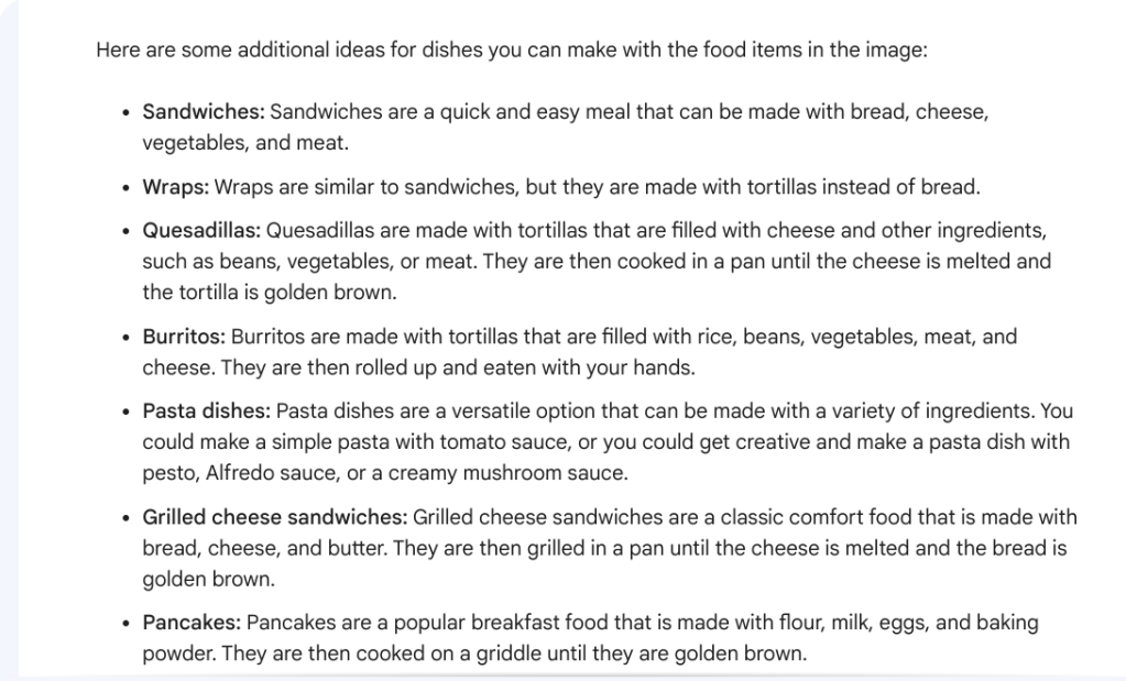 另一个绝佳的使用案例是添加生鲜食品的图片,然后让 Google Bard 想出各种食品食谱。您还可以添加冰箱中食品的图片,它就会毫不费力地为您创建个性化食谱。此外,你还可以向 Bard 询问世界各地的特色美食。如果你正在减肥,还可以让谷歌 Bard 为你制作无脂肪、低热量的饱腹食谱。