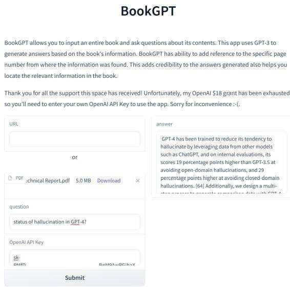 最后,在Hugging Face上还有一个BookGPT项目,可以让你上传一整本书。如果你有一个大文件,这个项目就适合你。它使用ChatGPT的API来处理和分析文件。唯一的缺点是,你需要添加你的OpenAI API密钥。下面是它的工作原理。
