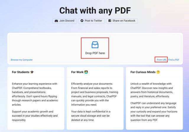1. 前往chatpdf.com,点击 “Drop PDF here“,上传您的PDF文件。