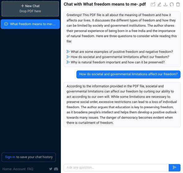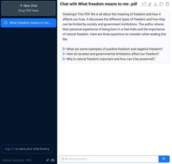4. 首先,它将显示该文件的摘要和三个建议的问题。你也可以在下面提出你的问题,并与PDF文件聊天。