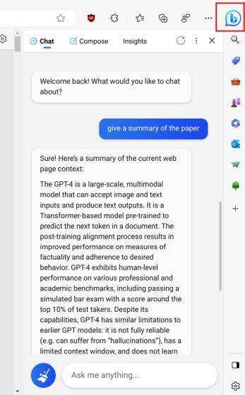 2. 现在,点击Bing侧边栏按钮,开始提问。你可以从摘要开始,它将从该标签中打开的文件中给出一个有背景的答案。