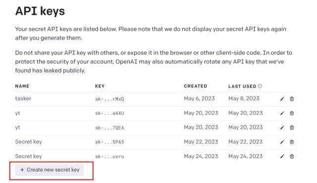 2. 然后,点击 “Create a new secret key“,复制API密钥。如果你已经用完了你的免费API额度,你需要添加一张信用卡来使用它。