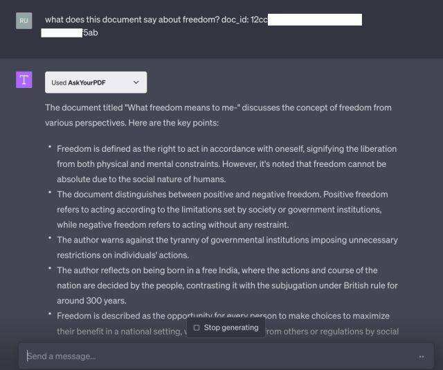 10. 只需粘贴文档ID并提出您的问题。它将自动识别您上传的文件,并让您只从该特定文件中提问。