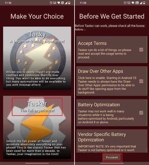 2. 一旦你安装了它,打开Tasker,在这里选择 “Tasker(The full experience!)”。接下来,允许所有的权限,并确保禁用Tasker的电池优化功能。为Tasker允许 “Background activity” 是很重要的。