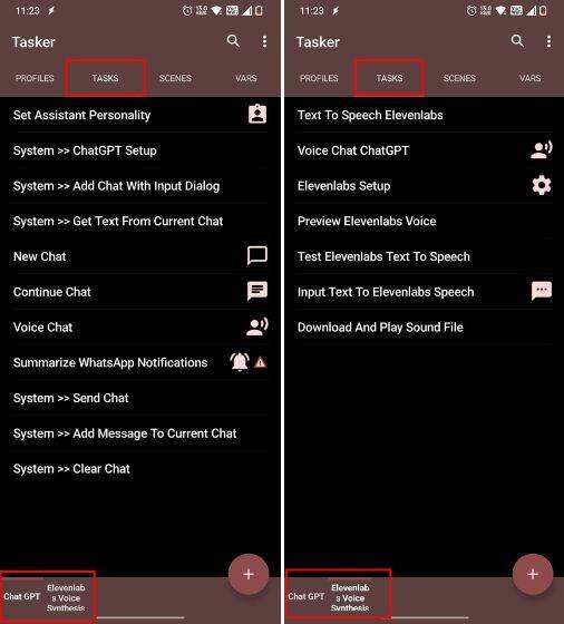 5. 如果你想探索其他设置和选项,你可以打开Tasker并移动到 “Tasks“标签。在两个导入的项目下,你可以单独运行任何一项任务。你还可以为文本聊天创建一个类似于上述步骤的快捷方式。