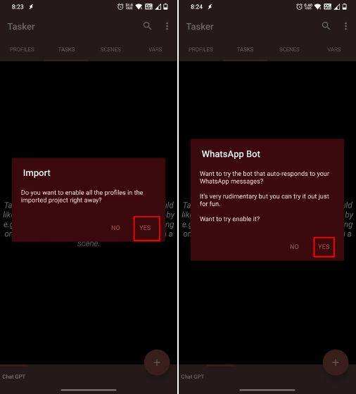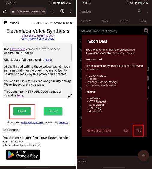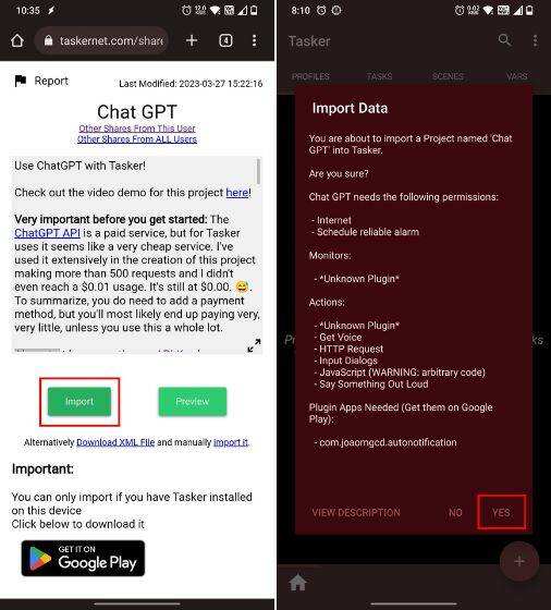 3. 之后,你需要通过访问这个链接将 “Chat GPT” 项目导入到Tasker。只需点击 “Import“,这将带你到Tasker。在这里,点击 “Yes” 来继续。在下一步,它可能要求你用你的谷歌账户登录。
