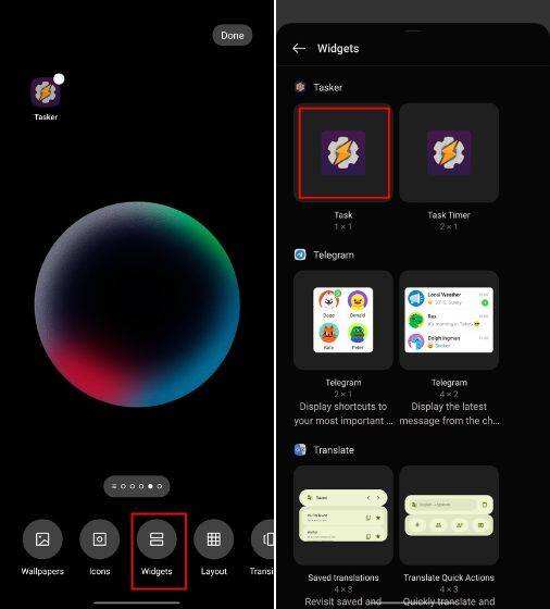 1. 现在要在安卓手机上用ChatGPT进行语音聊天,请进入主屏幕,点击并按住一个空白处。在这里,点击 “Widgets“,向下滚动到 “Tasker” 部分。