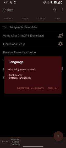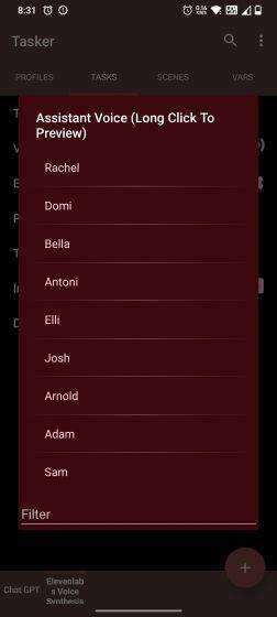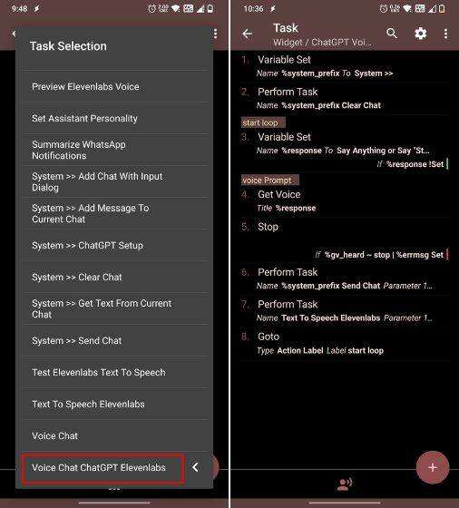 3. 现在你将看到一个任务选择菜单。向下滚动,在这里选择 “Voice Chat ChatGPT Elevenlabs“。现在,通过返回退出任务选择菜单,它将保存该部件。