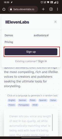 4. 同样地,我们也需要从ElevenLabs获得一个API密钥。这是一个人工智能语音平台,我们将使用它来使语音对话更加真实和自然,同时与Android上的ChatGPT互动。为此,请浏览这个链接并创建一个免费账户。