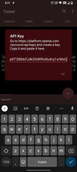5. 现在,粘贴你在第一步保存的OpenAI API密钥,然后点击 “OK” 继续。