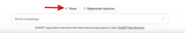 完成后,只需前往ChatGPT,您将开始看到输入文本框上方的 “Regenerate response” 按钮旁边有一个 “Share” 按钮。进入您想分享的聊天,只需点击这个按钮。