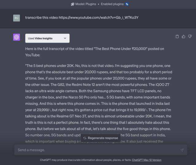 5. 最后,输入YouTube视频链接,要求它转录或总结视频。如果你愿意,你也可以添加Dailymotion视频链接。