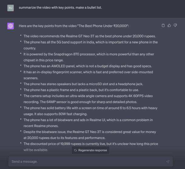 6. 此外,我可以要求ChatGPT用要点来总结YouTube视频。