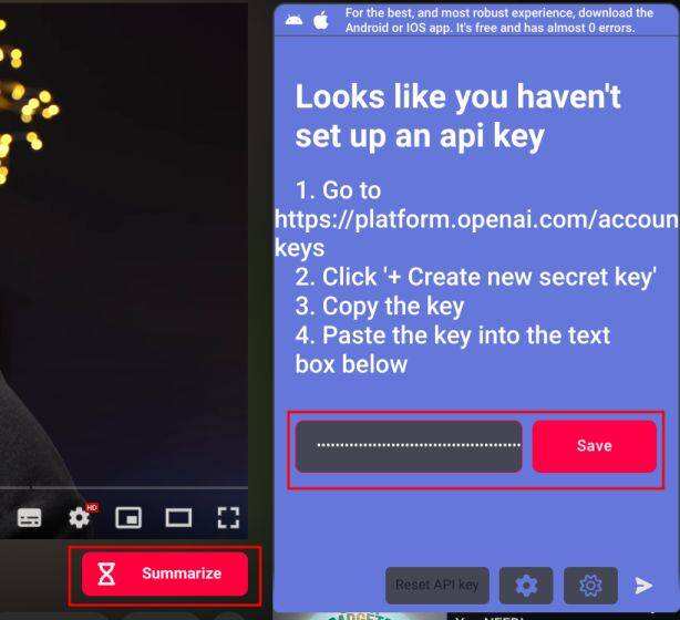 4. 接下来,打开一个YouTube视频,在视频的底部会出现一个 “Summarize” 按钮。点击它,将OpenAI的API密钥粘贴到文本字段中。最后,点击 “Save”。