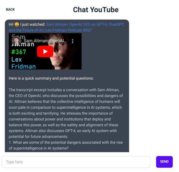 1. 如果你想免费与YouTube视频聊天,你可以去chatyoutube.com。这是一个很好的网站,它使用ChatGPT对视频进行总结,并从视频的背景中回答问题。请注意,它并不转录整个视频。