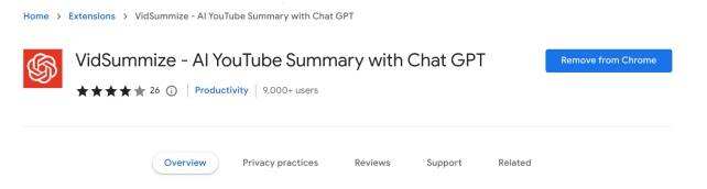 1. 如果你想使用Chrome扩展程序来总结YouTube视频,你可以从这里安装VidSummize扩展。请记住,它需要您自己的OpenAI API密钥。