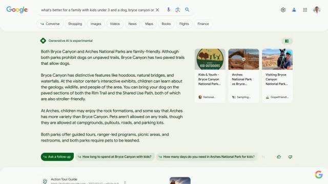 由于谷歌生成式AI搜索工作方式的这一鲜明变化,你可以一次性提出更长、更复杂的问题。在演示中,谷歌展示了如果你问 “What’s better for a family with kids under 3 and a dog, Bryce Canyon or Arches“。谷歌会用人工智能生成的关键信息快照来回应。正如你在上面看到的,你不需要搜索个别的查询和拼凑信息。你可以简单地要求生成型人工智能为你做繁重的工作。