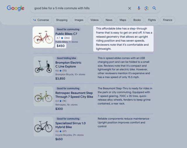 如果你想购买一个产品,你只需输入你的查询,新的生成式AI搜索将为你策划一个包含当前价格、评论、购买链接和其他相关信息的列表。事实上,它还会显示你在购买特定产品之前应该考虑哪些要点。