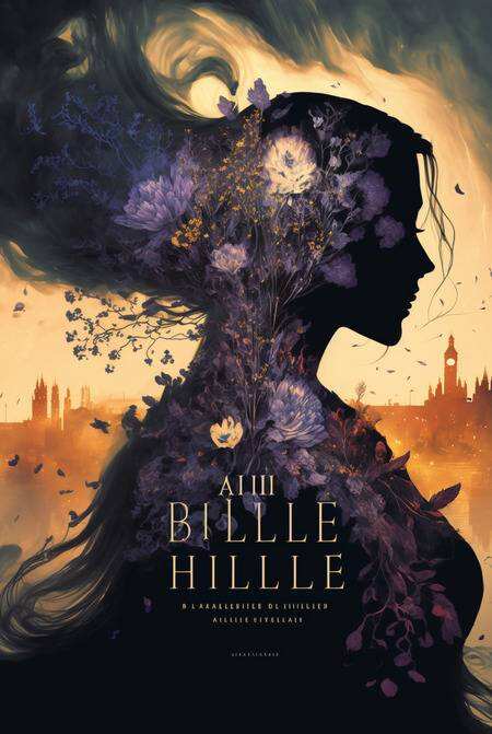Prompt: book cover, smoky effusion double exposure silhouette of Ophelia from Hamlet and big beautiful blossoming wildflowers, city and water beneath on background